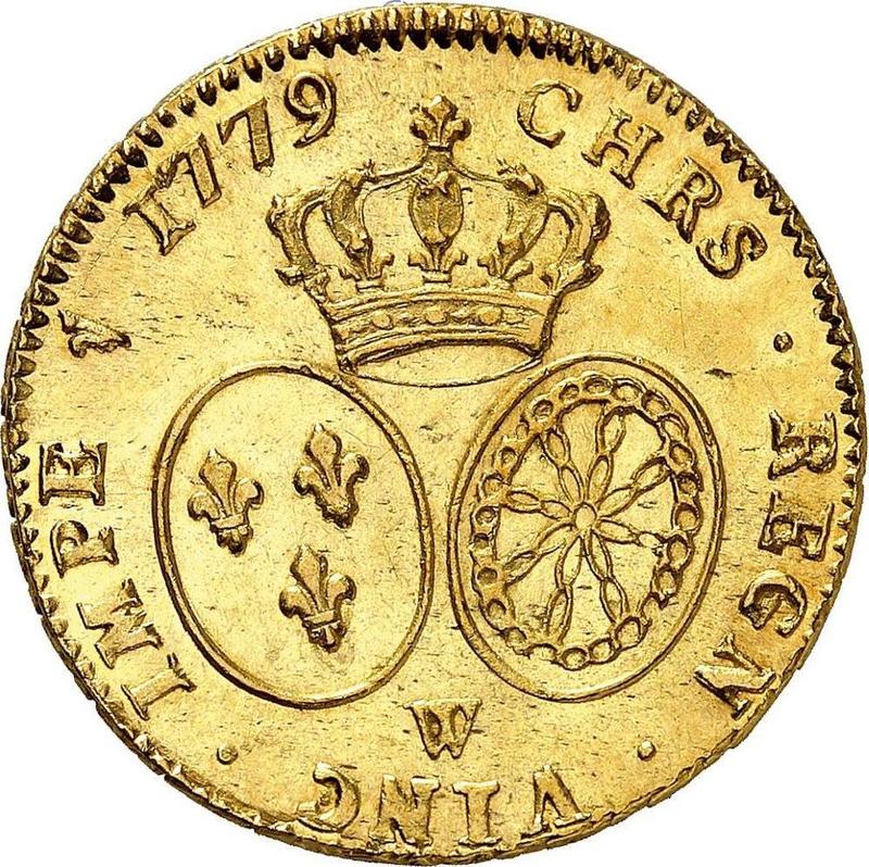 Find out the current coin value of the French Double Louis d'Or 1779 with mark W. Lille. This gold coin from the times of Louis XVI struck at the Lille Mint. Wondering how much a coin like this is worth? The record price belongs to the lot 316 sold at the Editions V. GADOURY auction for EUR 7,000. Bidding took place October 15, 2022.