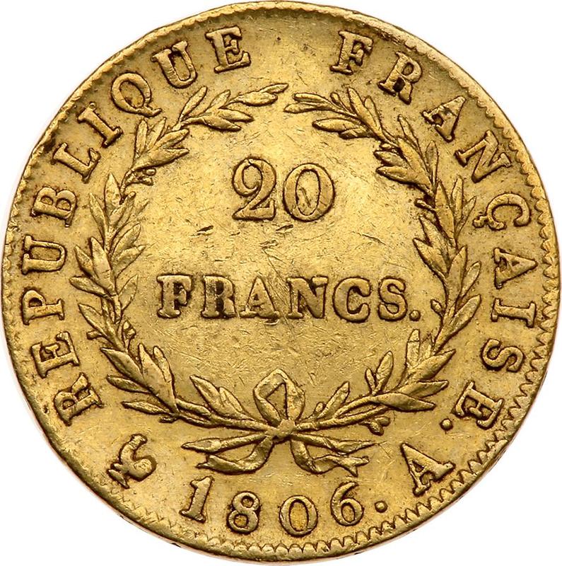 Find out the current coin value of the French 20 Francs 1806 with mark A. This gold coin from the times of Napoleon I struck at the Paris Mint. Wondering how much a coin like this is worth? The record price belongs to the lot 1117 sold at the SINCONA AG auction for CHF 17,497. Bidding took place May 15, 2018.