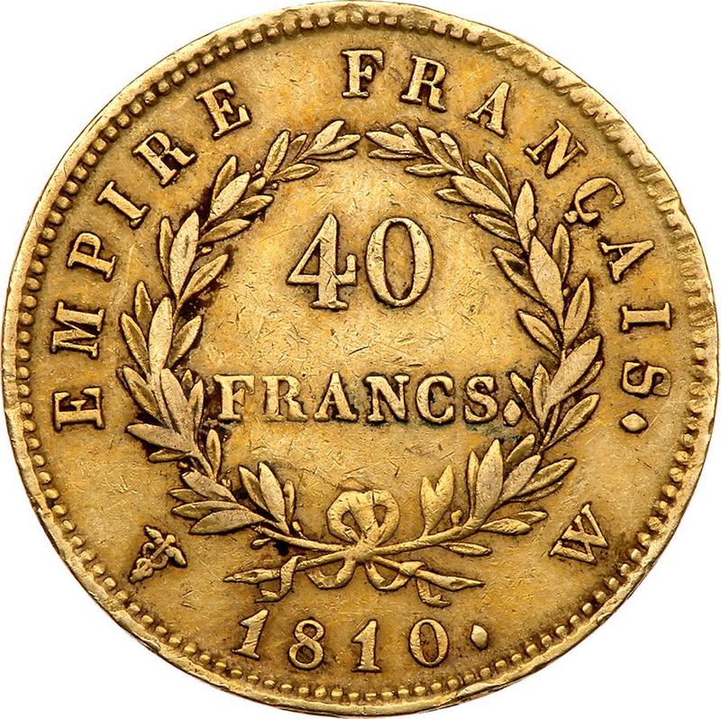 Find out the current coin value of the French 40 Francs 1810 with mark W. This gold coin from the times of Napoleon I struck at the Lille Mint. Wondering how much a coin like this is worth? The record price belongs to the lot 2064 sold at the Bonhams Knightsbridge auction for USD 64,350. Bidding took place December 8, 2010.