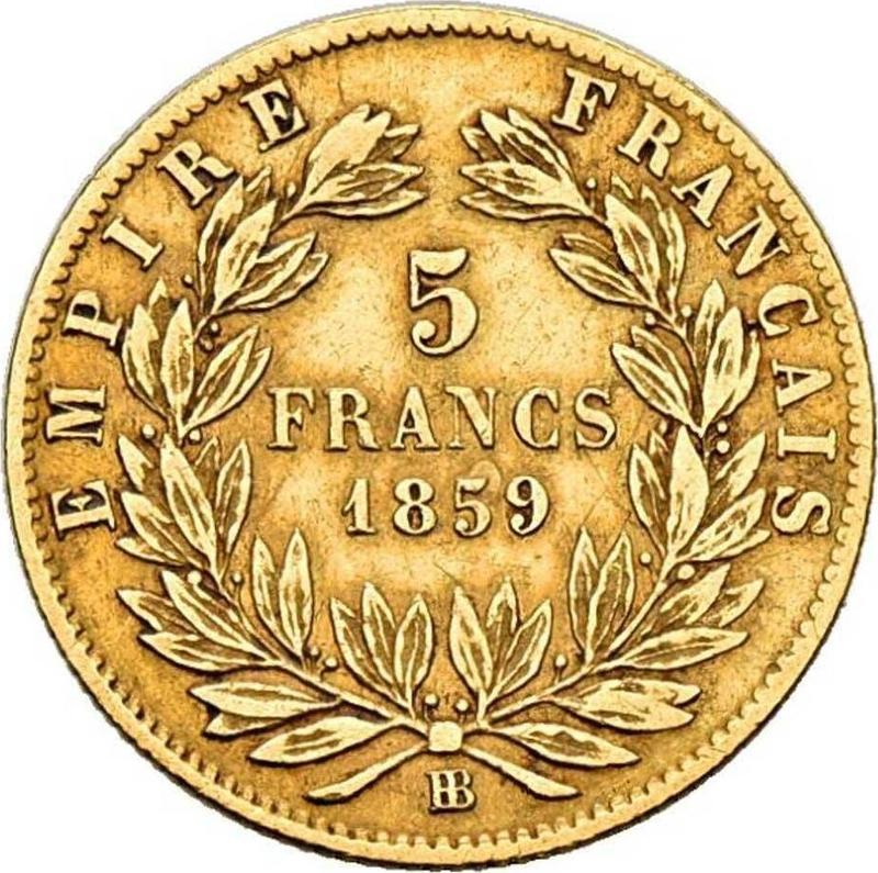 Find out the current coin value of the French 5 Francs 1859 with mark BB. This gold coin from the times of Napoleon III struck at the Strasbourg Mint. Wondering how much a coin like this is worth? The record price belongs to the lot 2123 sold at the Bonhams Knightsbridge auction for USD 9,360. Bidding took place December 8, 2010.