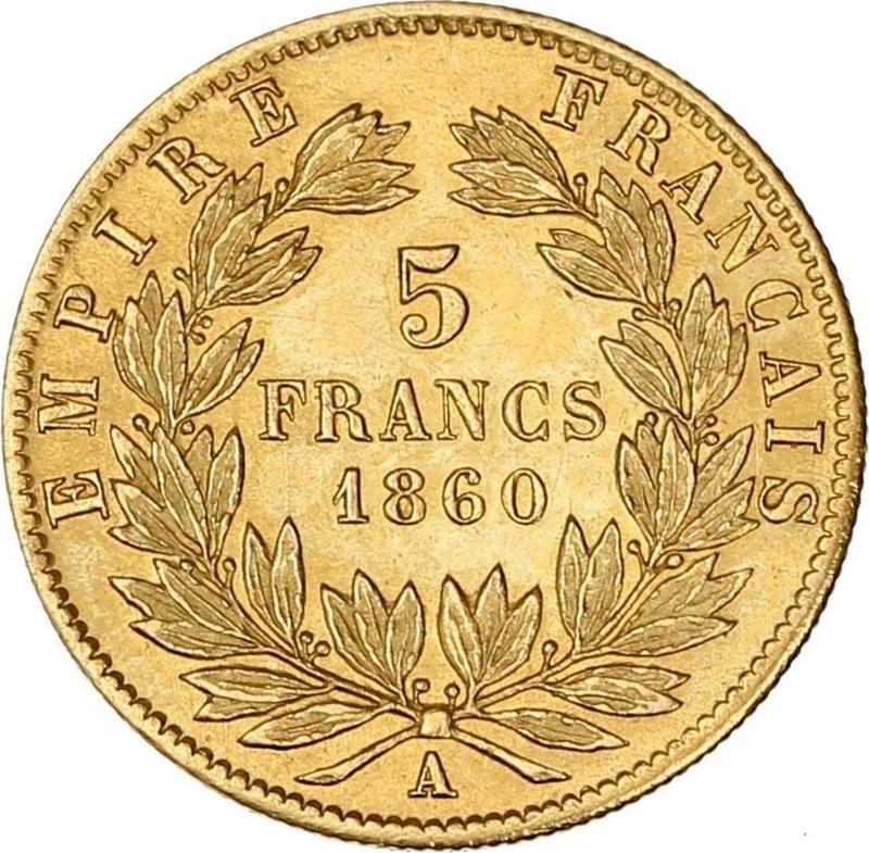 Find out the current coin value of the French 5 Francs 1860 with mark A. This gold coin from the times of Napoleon III struck at the Paris Mint. Wondering how much a coin like this is worth? The record price belongs to the lot 81 sold at the Katz Auction auction for EUR 2,320. Bidding took place December 27, 2023.