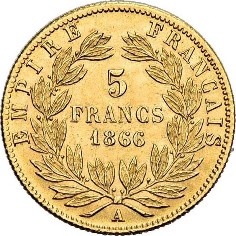 Find out the current coin value of the French 5 Francs 1866 with mark A. This gold coin from the times of Napoleon III struck at the Paris Mint. Wondering how much a coin like this is worth? The record price belongs to the lot 456 sold at the Maison Palombo auction for CHF 5,000. Bidding took place October 20, 2018.