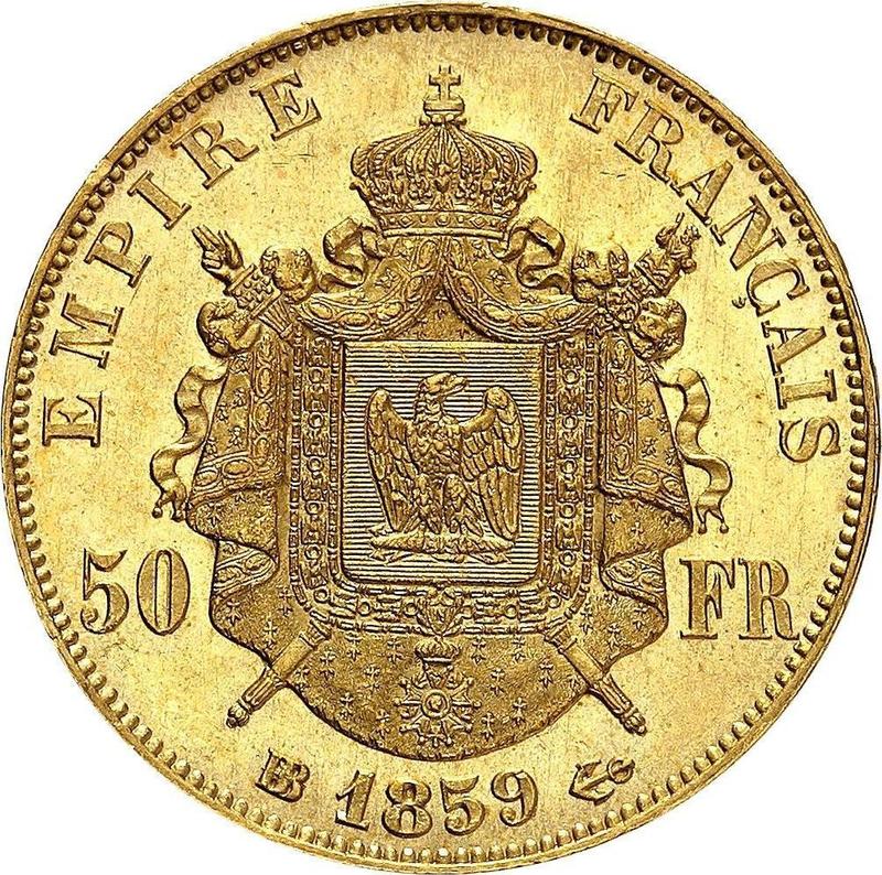 Find out the current coin value of the French 50 Francs 1859 with mark BB. This gold coin from the times of Napoleon III struck at the Strasbourg Mint. Wondering how much a coin like this is worth? The record price belongs to the lot 31332 sold at the Heritage Auctions auction for USD 6,600. Bidding took place November 1, 2024.