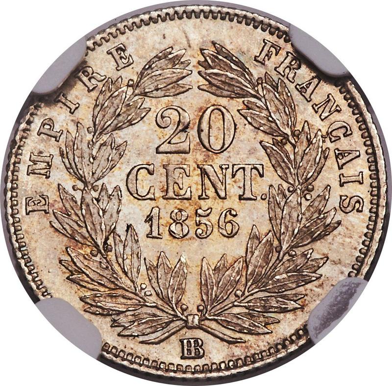 Find out the current coin value of the French 20 Centimes 1856 with mark BB. This silver coin from the times of Napoleon III struck at the Strasbourg Mint. Wondering how much a coin like this is worth? The record price belongs to the lot 51 sold at the MDC Monaco auction for EUR 3,000. Bidding took place May 20, 2017.