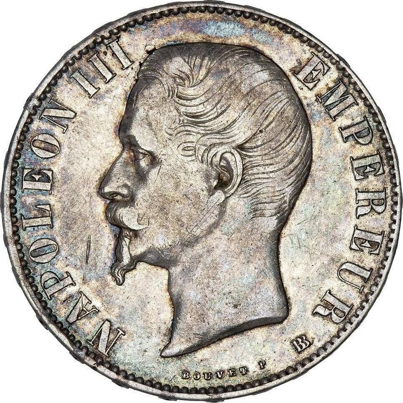 Find out the current coin value of the French 5 Francs 1856 with mark BB. This silver coin from the times of Napoleon III struck at the Strasbourg Mint. Wondering how much a coin like this is worth? The record price belongs to the lot 582 sold at the Fritz Rudolf Künker GmbH & Co. KG auction for EUR 550. Bidding took place June 20, 2023.