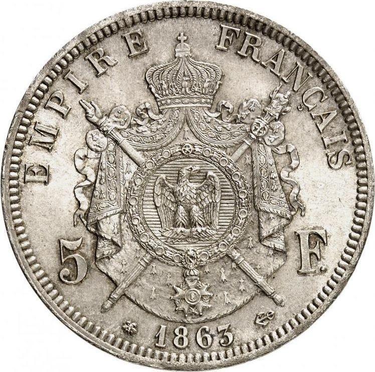 The information on the current value of the French coin 5 Francs 1863 with the letters A is based on actual auction sales of similar specimens. To reflect the current price level, our service monitors over 590 numismatic companies and records auction results in the coin catalog and auction archive. Please note that the exact value depends directly on the coin's condition, so the average price serves only as an approximate estimate.