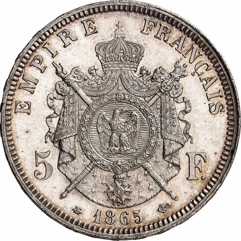Find out the current coin value of the French 5 Francs 1865 with mark A. This silver coin from the times of Napoleon III struck at the Paris Mint. Wondering how much a coin like this is worth? The record price belongs to the lot 778 sold at the iNumis auction for EUR 5,110. Bidding took place June 7, 2016.