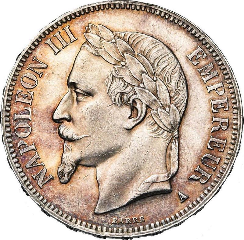 Find out the current coin value of the French 5 Francs 1868 with mark A. This silver coin from the times of Napoleon III struck at the Paris Mint. Wondering how much a coin like this is worth? The record price belongs to the lot 482 sold at the Maison Palombo auction for CHF 3,200. Bidding took place December 12, 2020.