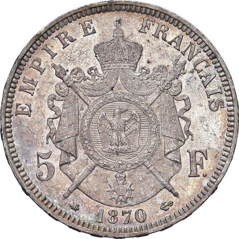 Find out the current coin value of the French 5 Francs 1870 with mark A. This silver coin from the times of Napoleon III struck at the Paris Mint. Wondering how much a coin like this is worth? The record price belongs to the lot 30505 sold at the Heritage Auctions auction for USD 30,000. Bidding took place January 12, 2020.