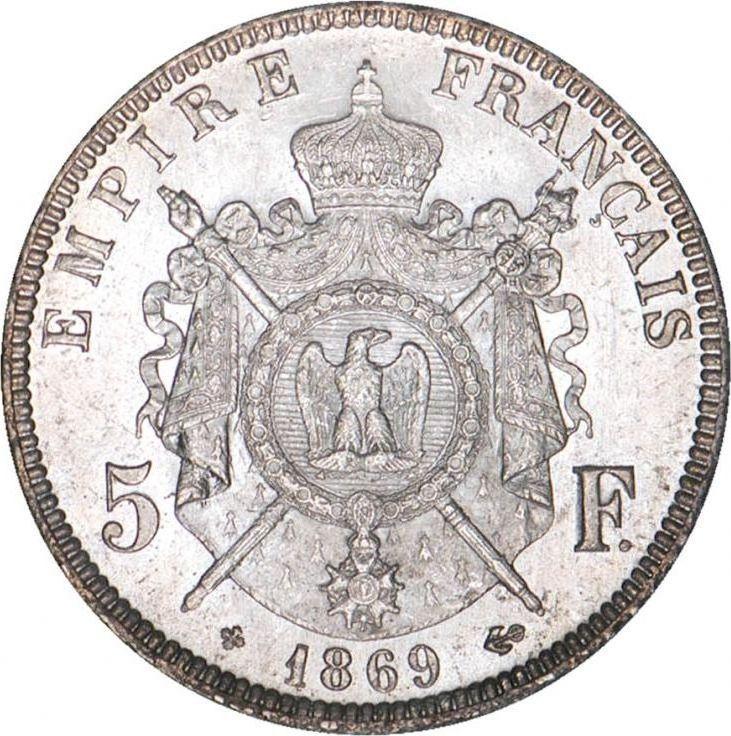 Find out the current coin value of the French 5 Francs 1869 with mark BB. This silver coin from the times of Napoleon III struck at the Strasbourg Mint. Wondering how much a coin like this is worth? The record price belongs to the lot 695 sold at the Nihon Coin Auction auction for JPY 120,000. Bidding took place December 10, 2017.