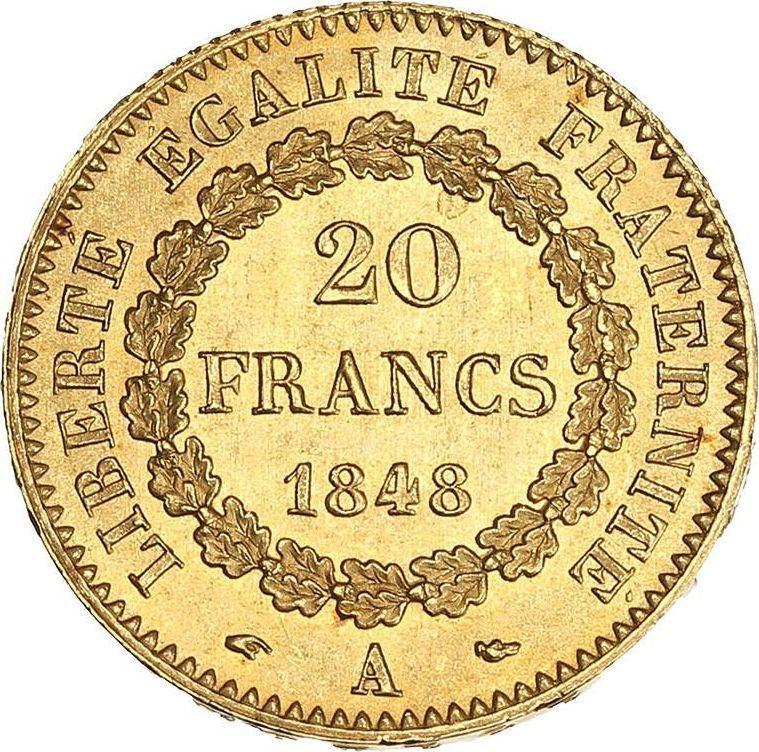 Find out the current coin value of the French 20 Francs 1848 with mark A. This gold coin from the times of Second Republic struck at the Paris Mint. Wondering how much a coin like this is worth? The record price belongs to the lot 169 sold at the Beaussant Lefèvre - Expert: Thierry Parsy auction for EUR 6,000. Bidding took place April 7, 2022.