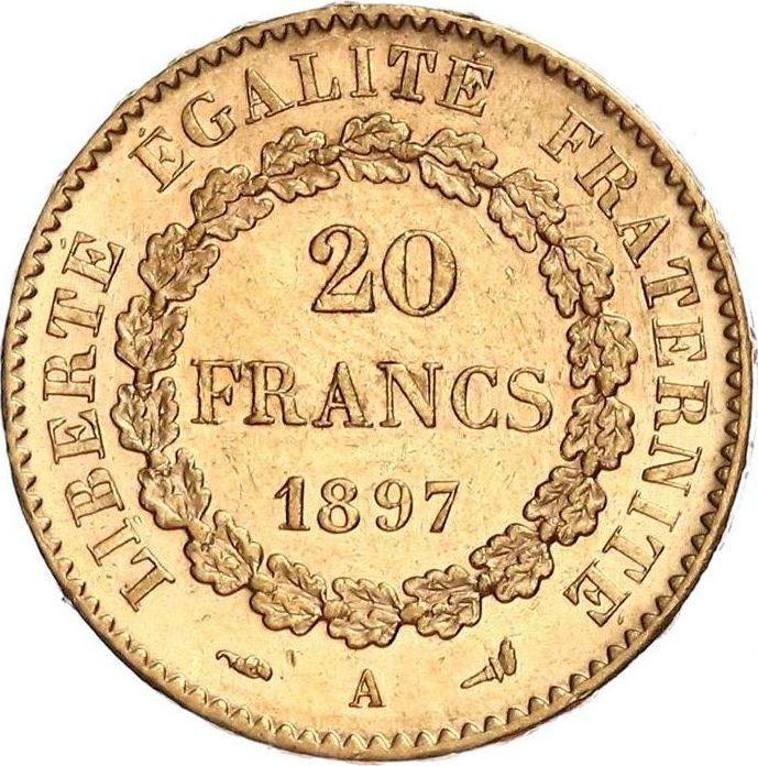 Find out the current coin value of the French 20 Francs 1897 with mark A. This gold coin from the times of Third Republic struck at the Paris Mint. Wondering how much a coin like this is worth? The record price belongs to the lot 22225 sold at the Heritage Auctions auction for USD 2,040. Bidding took place June 11, 2023.