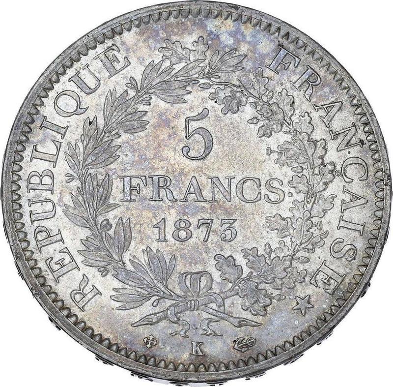 Find out the current coin value of the French 5 Francs 1873 "Hercules" with mark K. This silver coin from the times of Third Republic struck at the Bordeaux Mint. Wondering how much a coin like this is worth? The record price belongs to the lot 465 sold at the Fritz Rudolf Künker GmbH & Co. KG auction for EUR 3,800. Bidding took place January 29, 2025.