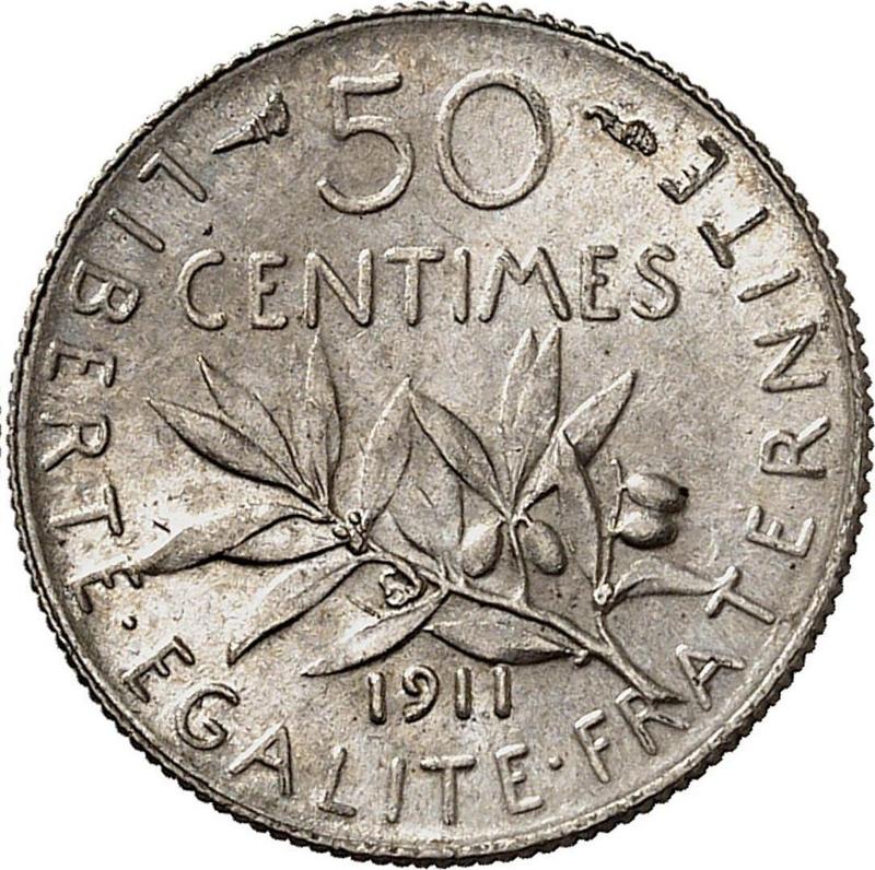 Find out the current coin value of the French 50 Centimes 1911 "Sower". This silver coin from the times of Third Republic struck at the Paris Mint. Wondering how much a coin like this is worth? The record price belongs to the lot 1228 sold at the iNumis auction for EUR 210. Bidding took place March 23, 2012.