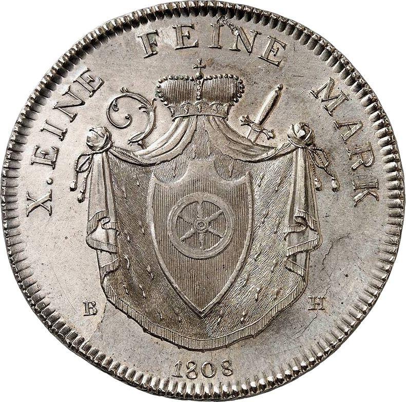 Find out the current coin value of the Frankfurt Thaler 1808 with mark BH. This silver coin from the times of Karl Theodor von Dalberg. Wondering how much a coin like this is worth? The record price belongs to the lot 186 sold at the MDC Monaco auction for EUR 2,500. Bidding took place June 3, 2022.