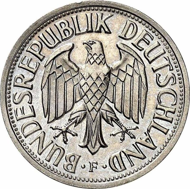 Find out the current coin value of the German 1 Mark 1954 with mark F. This copper-nickel coin from the times FRG struck at the Stuttgart Mint. Wondering how much a coin like this is worth? The record price belongs to the lot 4415 sold at the Heidelberger Münzhandlung Herbert Grün auction for EUR 360. Bidding took place May 10, 2021.