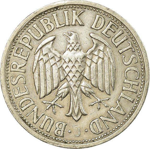 Find out the current coin value of the German 1 Mark 1965 with mark J. This copper-nickel coin from the times FRG struck at the Hamburg Mint