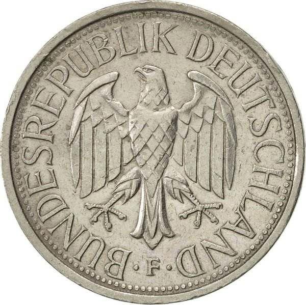Find out the current coin value of the German 1 Mark 1978 with mark F. This copper-nickel coin from the times FRG struck at the Stuttgart Mint