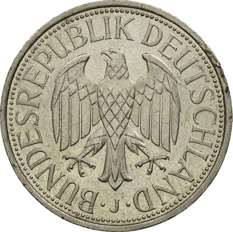 Find out the current coin value of the German 1 Mark 1990 with mark J. This copper-nickel coin from the times FRG struck at the Hamburg Mint