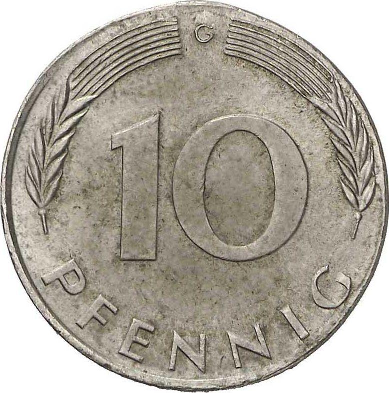 Find out the current coin value of the German 10 Pfennig 1972 with mark G. Nickel. This nickel coin from the times FRG struck at the Karlsruhe Mint. Wondering how much a coin like this is worth? The record price belongs to the lot 7926 sold at the Auktionshaus Felzmann auction for EUR 350. Bidding took place March 6, 2012.