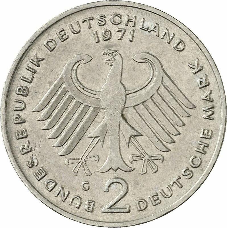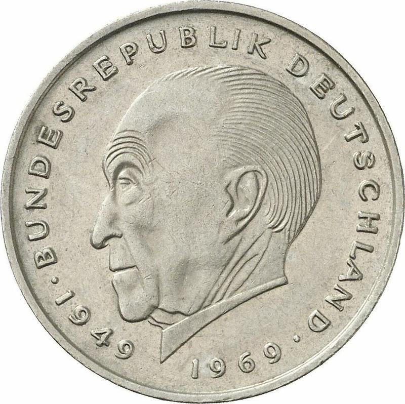Find out the current coin value of the German 2 Mark 1971 "Konrad Adenauer" with mark G. This copper-nickel coin from the times FRG struck at the Karlsruhe Mint