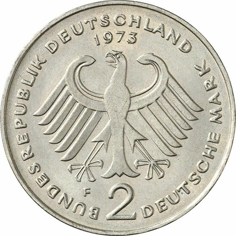 Find out the current coin value of the German 2 Mark 1973 "Konrad Adenauer" with mark F. This copper-nickel coin from the times FRG struck at the Stuttgart Mint