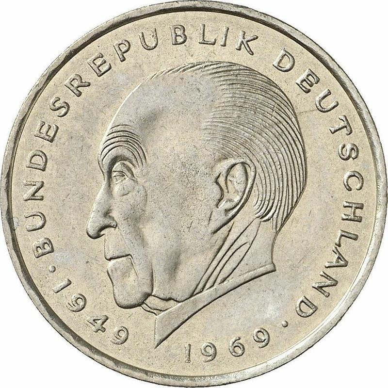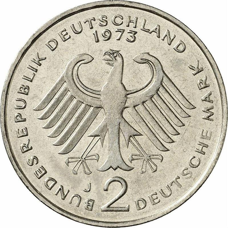 According to the latest data as of December 6, 2025 the average price of a coin 2 Mark 1973 "Konrad Adenauer" with mark J is 2 USD. The coin is made of non-precious metal, so in poor condition it may have extremely low value and liquidity.