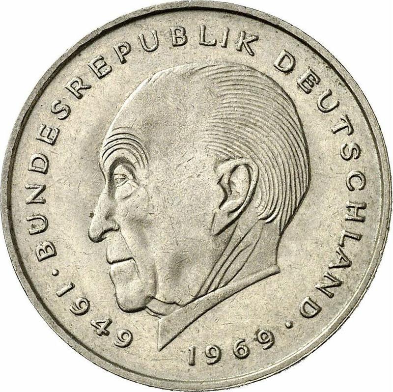 According to the latest data as of December 5, 2025 the average price of a coin 2 Mark 1977 "Konrad Adenauer" with mark F is 90 USD. The coin is made of non-precious metal, so in poor condition it may have extremely low value and liquidity.