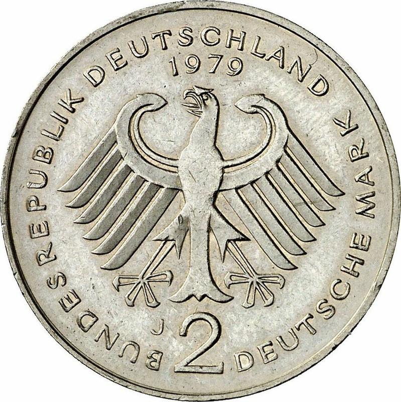 Find out the current coin value of the German 2 Mark 1979 "Kurt Schumacher" with mark J. This copper-nickel coin from the times FRG struck at the Hamburg Mint