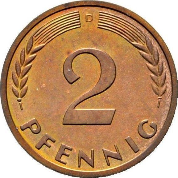Find out the current coin value of the German 2 Pfennig 1960 with mark D. This bronze coin from the times FRG struck at the Munich Mint. Wondering how much a coin like this is worth? The record price belongs to the lot 1313 sold at the Fritz Rudolf Künker GmbH & Co. KG auction for EUR 165. Bidding took place January 29, 2021.