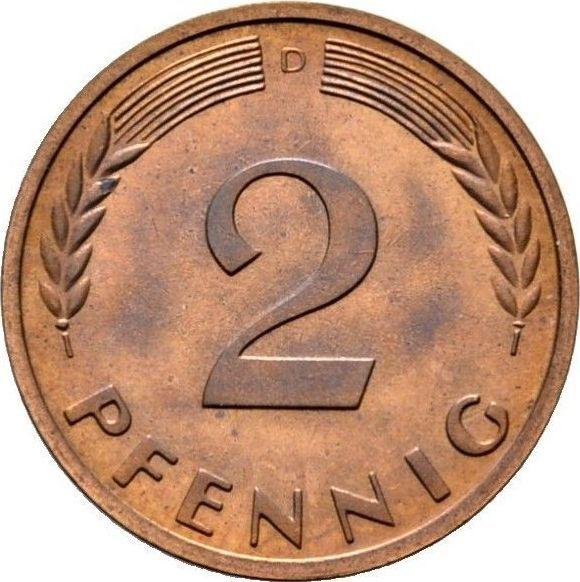 Find out the current coin value of the German 2 Pfennig 1961 with mark D. This bronze coin from the times FRG struck at the Munich Mint. Wondering how much a coin like this is worth? The record price belongs to the lot 2557 sold at the Fritz Rudolf Künker GmbH & Co. KG auction for EUR 340. Bidding took place February 7, 2017.