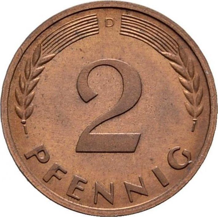 Find out the current coin value of the German 2 Pfennig 1963 with mark D. This bronze coin from the times FRG struck at the Munich Mint. Wondering how much a coin like this is worth? The record price belongs to the lot 1588 sold at the Fritz Rudolf Künker GmbH & Co. KG auction for EUR 200. Bidding took place July 25, 2017.