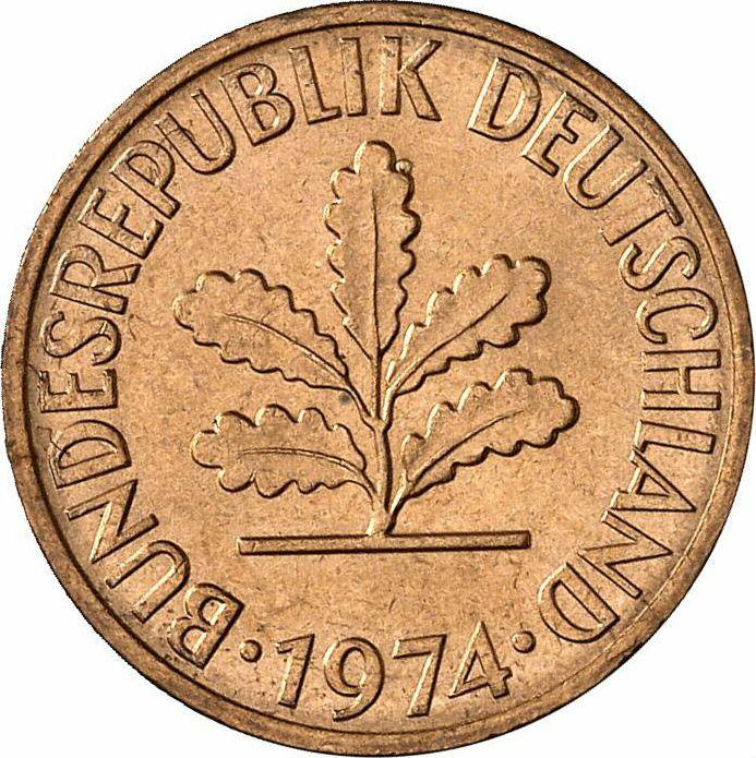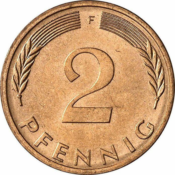 Find out the current coin value of the German 2 Pfennig 1974 with mark F. This steel coin from the times FRG struck at the Stuttgart Mint