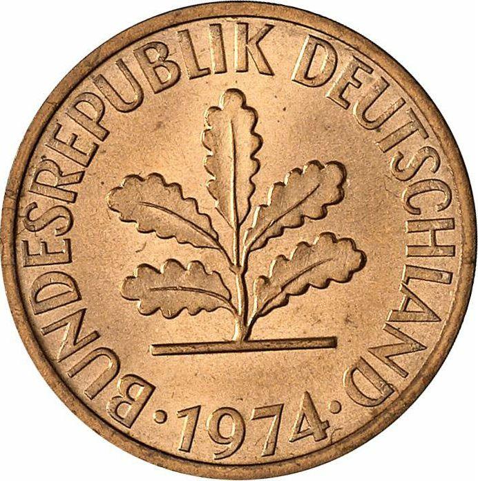 Find out the current coin value of the German 2 Pfennig 1974 with mark G. This steel coin from the times FRG struck at the Karlsruhe Mint. Wondering how much a coin like this is worth? The record price belongs to the lot 633 sold at the Münzenhandlung Harald Möller GmbH auction for EUR 280. Bidding took place November 19, 2024.