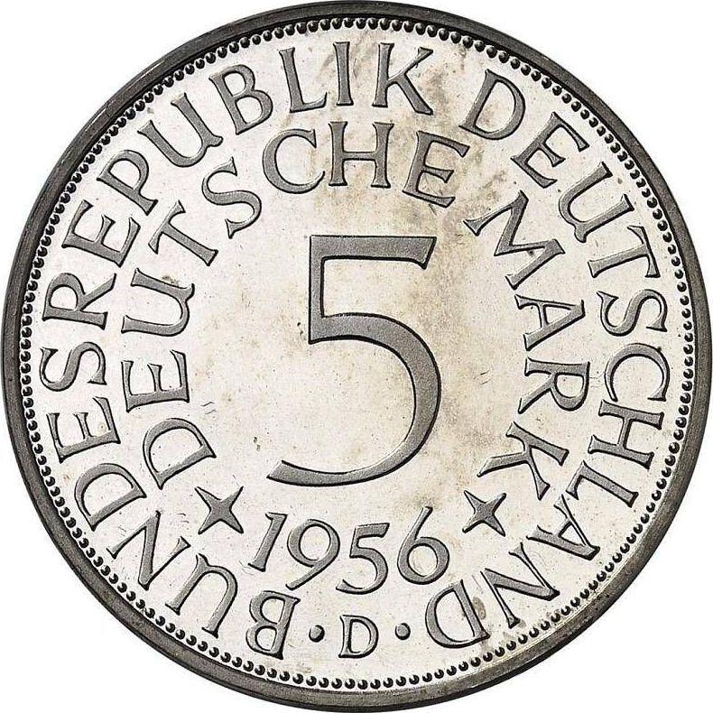 According to the latest data as of December 5, 2025 the average price of a Silver coin 5 Mark 1956 with mark D is 70 USD for regular strike and 980 USD for coins minted using the PROOF technology.