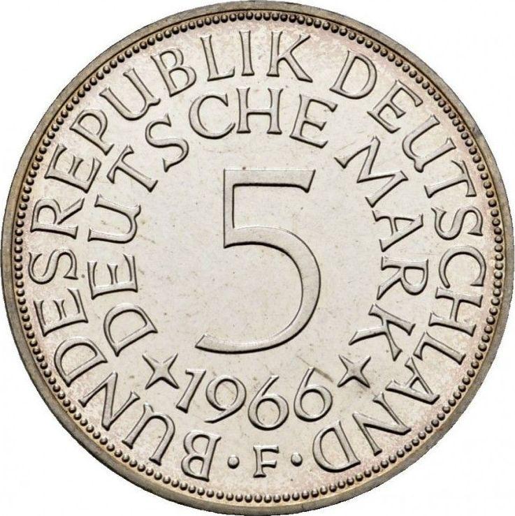 According to the latest data as of December 5, 2025 the average price of a Silver coin 5 Mark 1966 with mark F is 70 USD for regular strike and 340 USD for coins minted using the PROOF technology.
