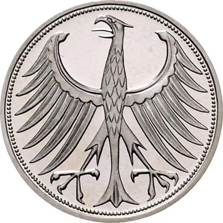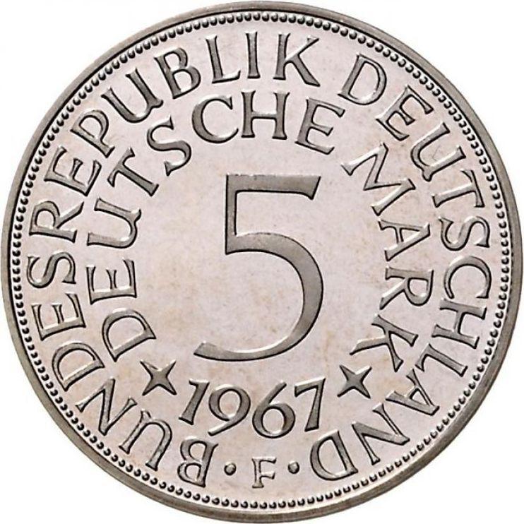 According to the latest data as of December 5, 2025 the average price of a Silver coin 5 Mark 1967 with mark F is 45 USD for regular strike and 150 USD for coins minted using the PROOF technology.