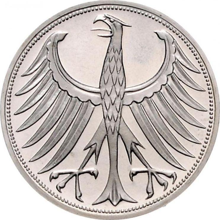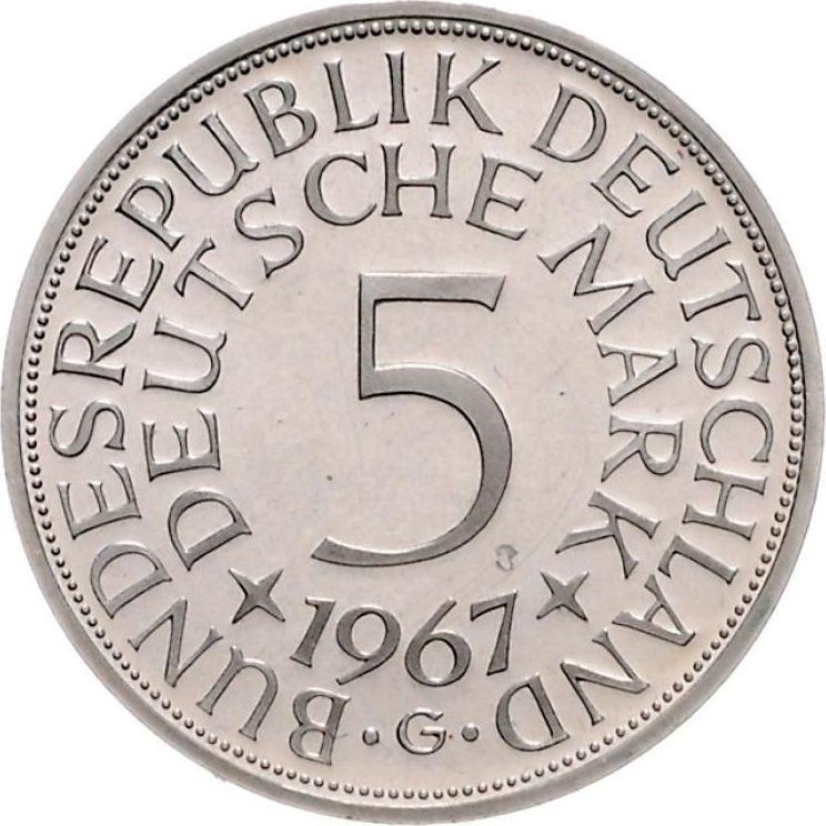 According to the latest data as of December 5, 2025 the average price of a Silver coin 5 Mark 1967 with mark G is 45 USD for regular strike and 95 USD for coins minted using the PROOF technology.