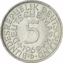 The information on the current value of the German coin 5 Mark 1969 with the letters D is based on actual auction sales of similar specimens. To reflect the current price level, our service monitors over 590 numismatic companies and records auction results in the coin catalog and auction archive. Please note that the exact value depends directly on the coin's condition, so the average price serves only as an approximate estimate.