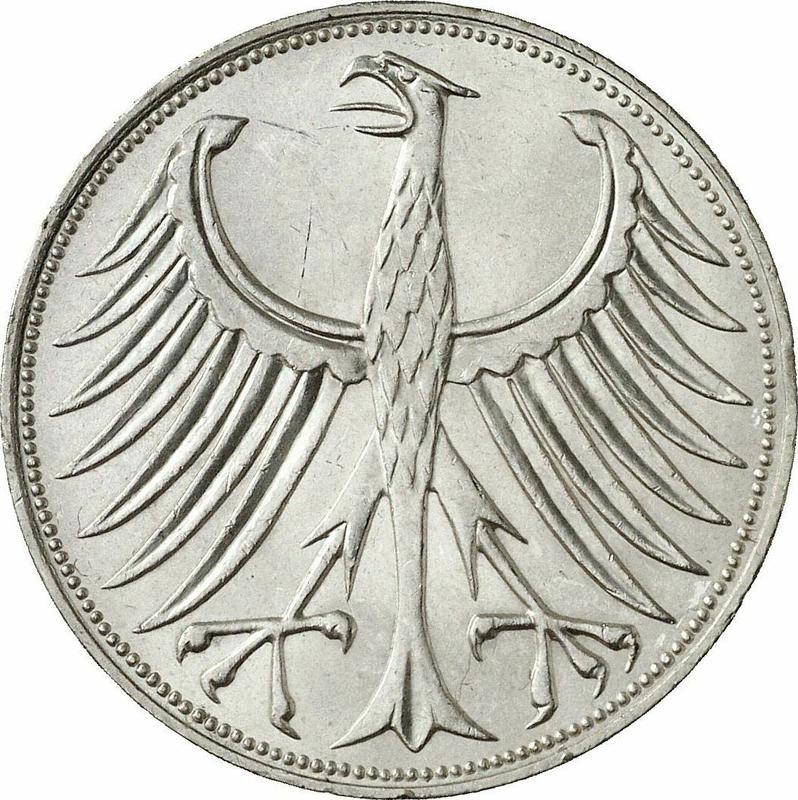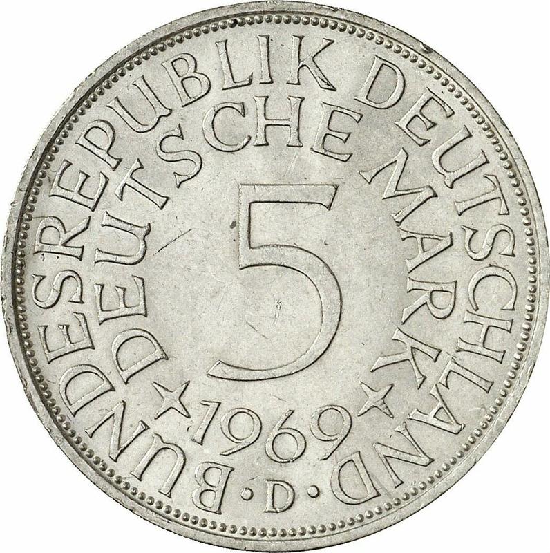 Find out the current coin value of the German 5 Mark 1969 with mark D. This silver coin from the times FRG struck at the Munich Mint. Wondering how much a coin like this is worth? The record price belongs to the lot 8825 sold at the Fritz Rudolf Künker GmbH & Co. KG auction for EUR 110. Bidding took place March 3, 2025.