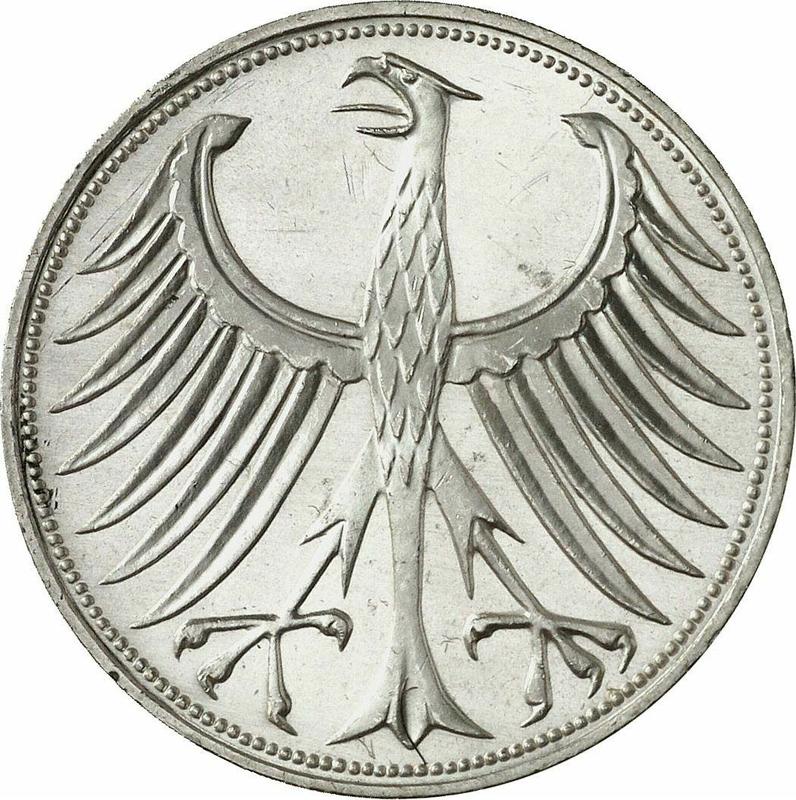 Find out the current coin value of the German 5 Mark 1970 with mark G. This silver coin from the times FRG struck at the Karlsruhe Mint. Wondering how much a coin like this is worth? The record price belongs to the lot 8826 sold at the Fritz Rudolf Künker GmbH & Co. KG auction for EUR 28. Bidding took place March 3, 2025.