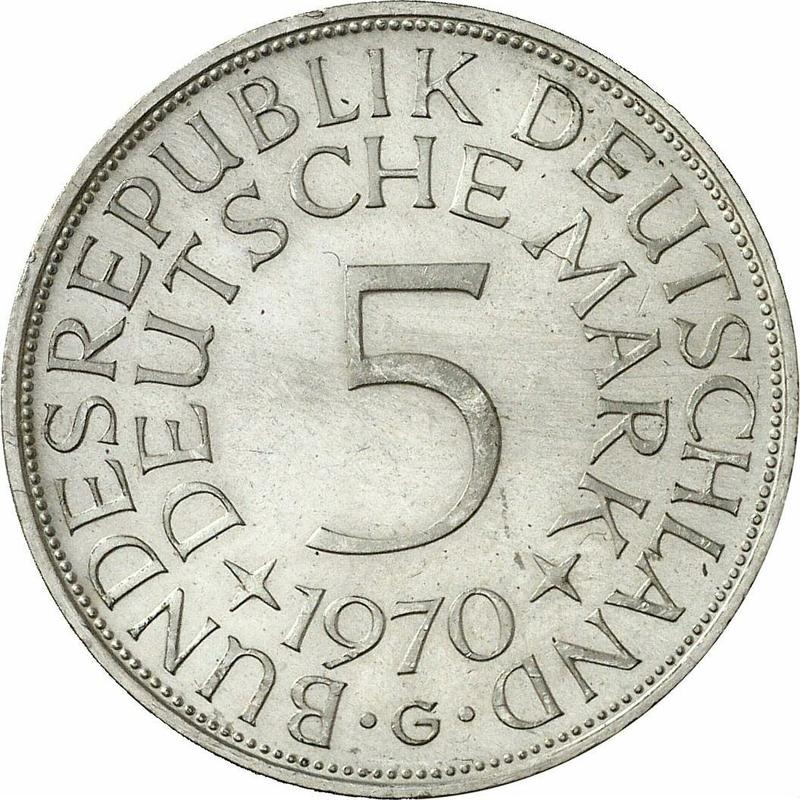 According to the latest data as of December 5, 2025 the average price of a Silver coin 5 Mark 1970 with mark G is 15 USD for regular strike and 25 USD for coins minted using the PROOF technology.