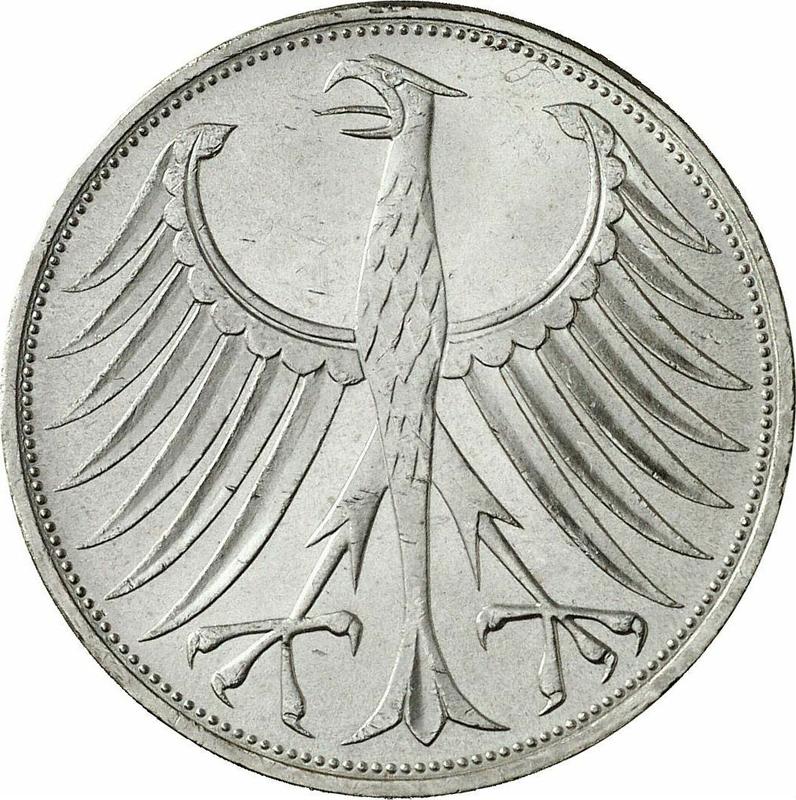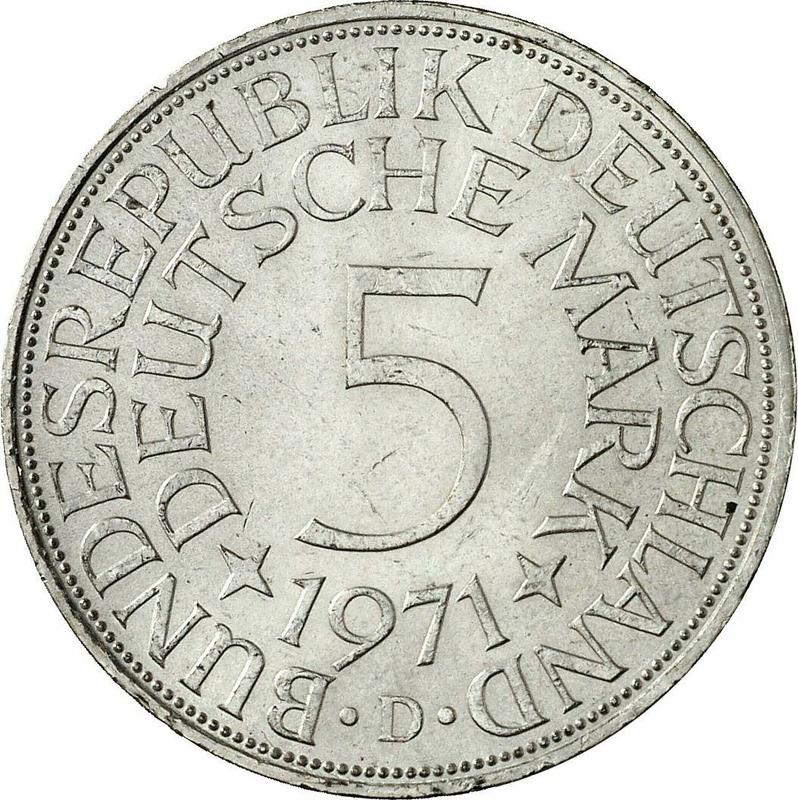 Find out the current coin value of the German 5 Mark 1971 with mark D. This silver coin from the times FRG struck at the Munich Mint. Wondering how much a coin like this is worth? The record price belongs to the lot 588 sold at the Katz Auction auction for EUR 16. Bidding took place June 3, 2024.