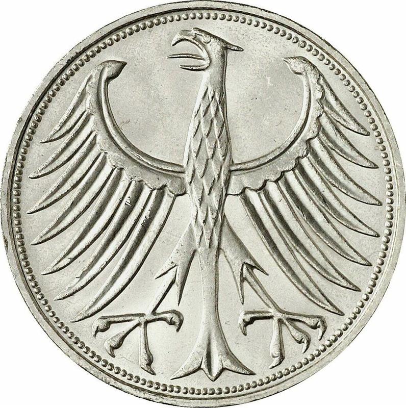 Find out the current coin value of the German 5 Mark 1973 with mark J. This silver coin from the times FRG struck at the Hamburg Mint. Wondering how much a coin like this is worth? The record price belongs to the lot 9463 sold at the Fritz Rudolf Künker GmbH & Co. KG auction for EUR 42. Bidding took place February 26, 2024.