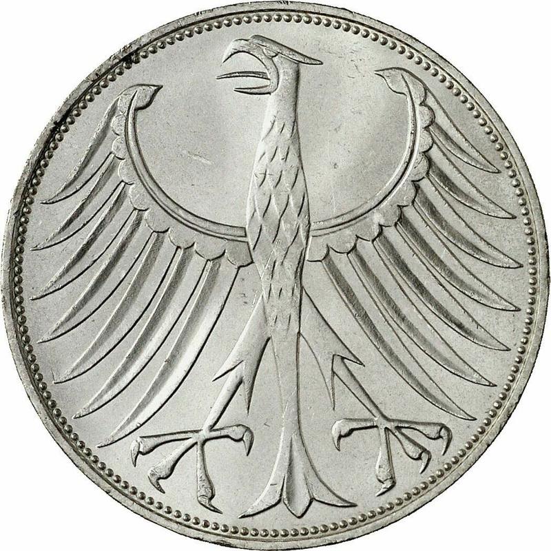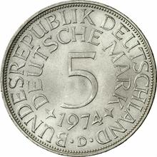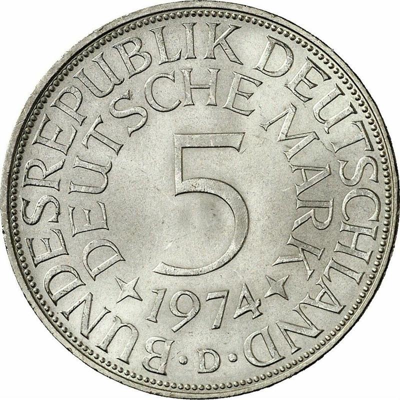Find out the current coin value of the German 5 Mark 1974 with mark D. This silver coin from the times FRG struck at the Munich Mint. Wondering how much a coin like this is worth? The record price belongs to the lot 647 sold at the Leipziger Münzhandlung Heidrun Höhn auction for EUR 50. Bidding took place April 19, 2013.