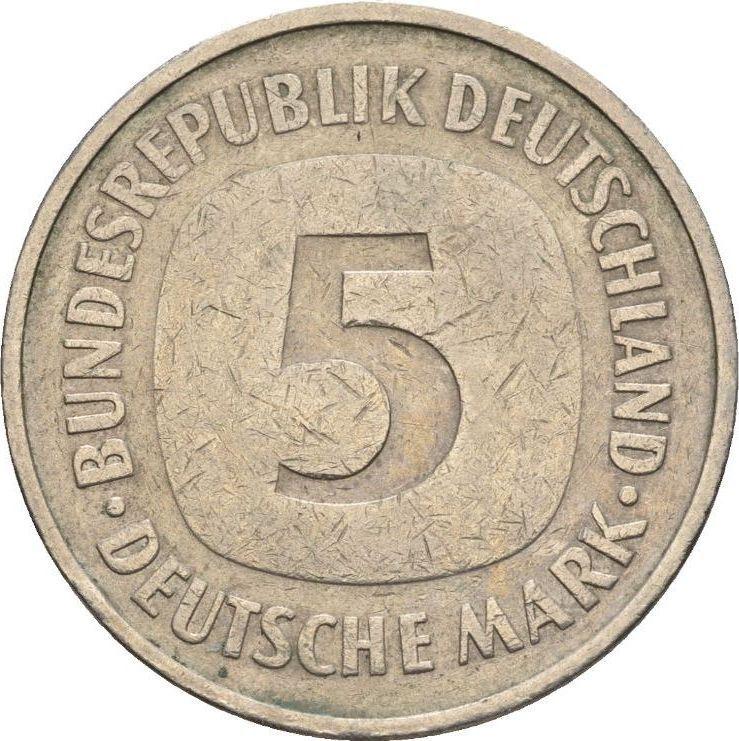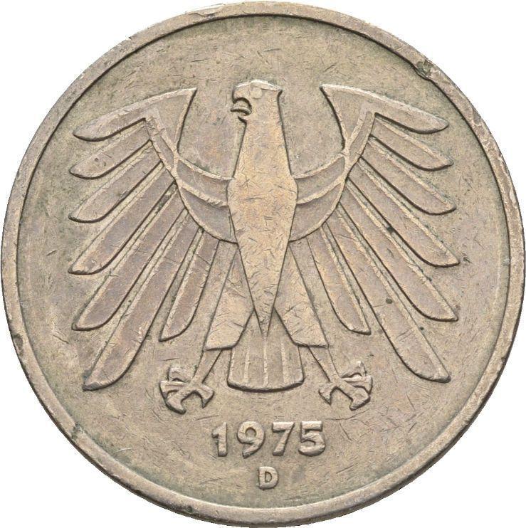 Find out the current coin value of the German 5 Mark 1975 with mark D. This nickel coin from the times FRG struck at the Munich Mint. Wondering how much a coin like this is worth? The record price belongs to the lot 85001 sold at the Wormser Auktionshaus auction for EUR 55. Bidding took place May 31, 2022.