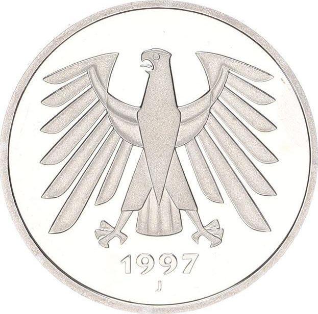 To sell the 5 Mark 1997 with the letters J we recommend contacting specialized numismatic companies that hold regular auction sales. Public auctions are the most fair and secure way to sell valuable collectible coins. Go to the list of companies to find a suitable platform.