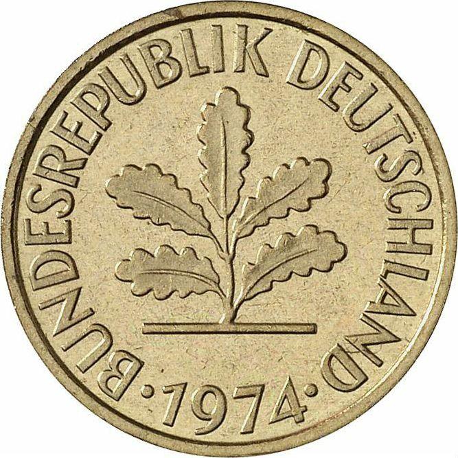 According to the latest data as of December 5, 2025 the average price of a coin 5 Pfennig 1974 with mark F is 510 USD. The coin is made of non-precious metal, so in poor condition it may have extremely low value and liquidity.
