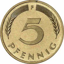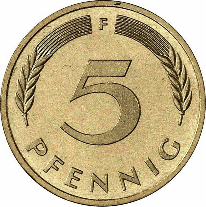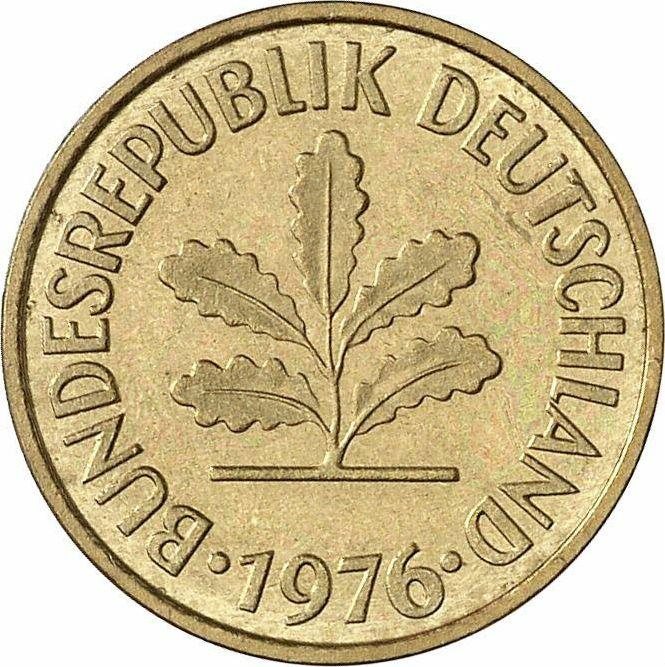 Find out the current coin value of the German 5 Pfennig 1976 with mark F. This iron coin from the times FRG struck at the Stuttgart Mint