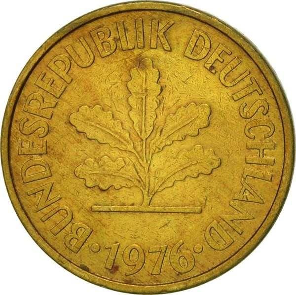 Find out the current coin value of the German 5 Pfennig 1976 with mark G. This iron coin from the times FRG struck at the Karlsruhe Mint